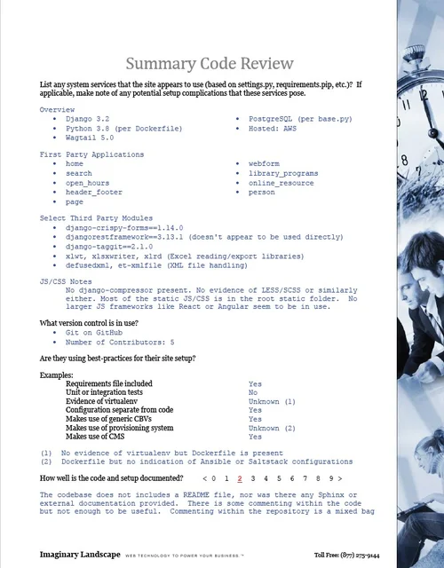Here's an example of the information contained in your code review. You can click on the screenshots below to download the full size PDF.